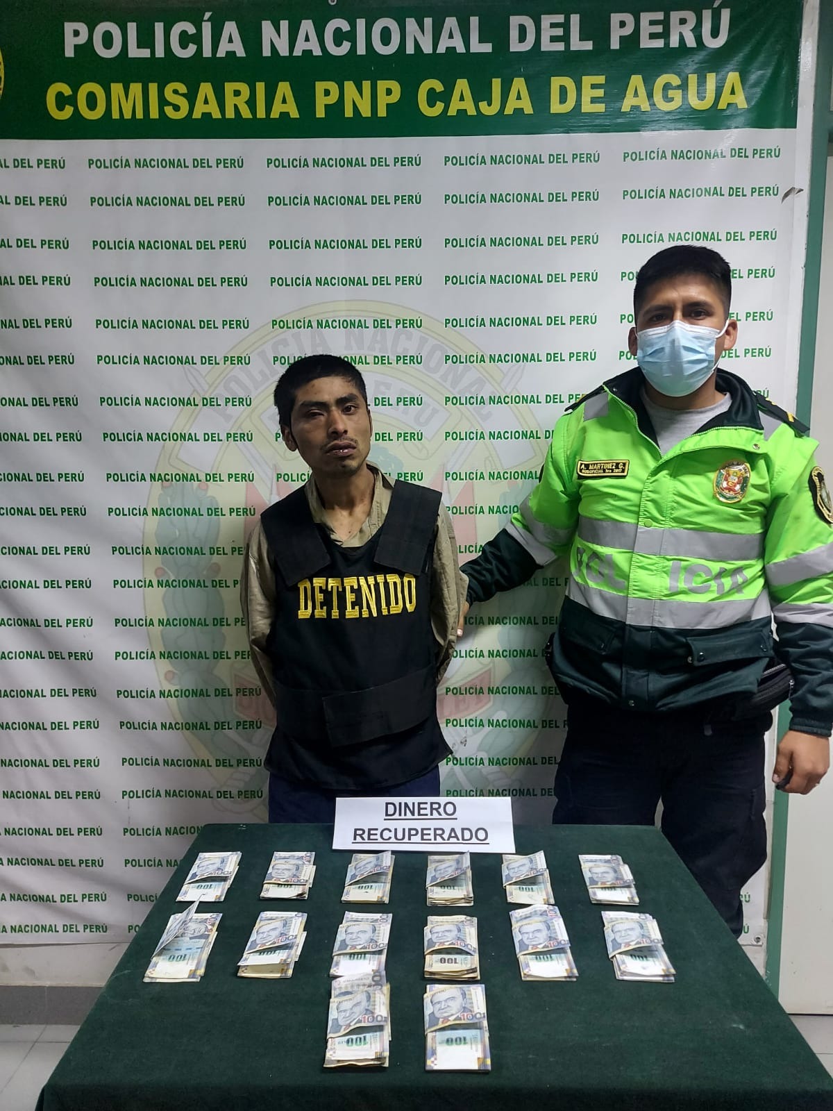 Uno de los nietos del octogenario se percató de este robo y, con otros miembros de su familia, salieron a la calle a buscar al ladrón. Avisaron de inmediato a los policías de la comisaría de Caja de Agua y los agentes patrullaron por la zona en busca del ratero. Lo encontraron en la avenida Perú, a unas cuadras de la casa de la familia afectada en el pasaje José Olaya. Intentó negar el delito, pero en el registro personal le encontraron los 14 mil soles en la pretina del pantalón.