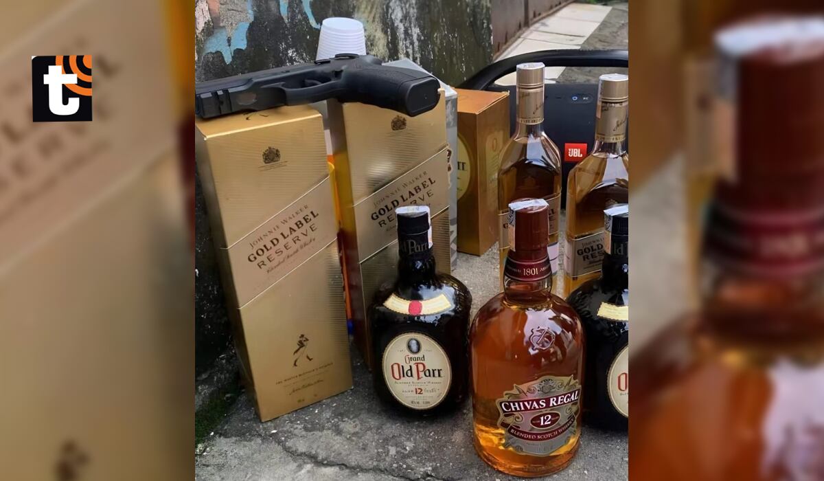 Cajas y botellas de whisky escocés premium, de las más caras en el mercado, colocadas encima de mesas y al lado de una pistola.