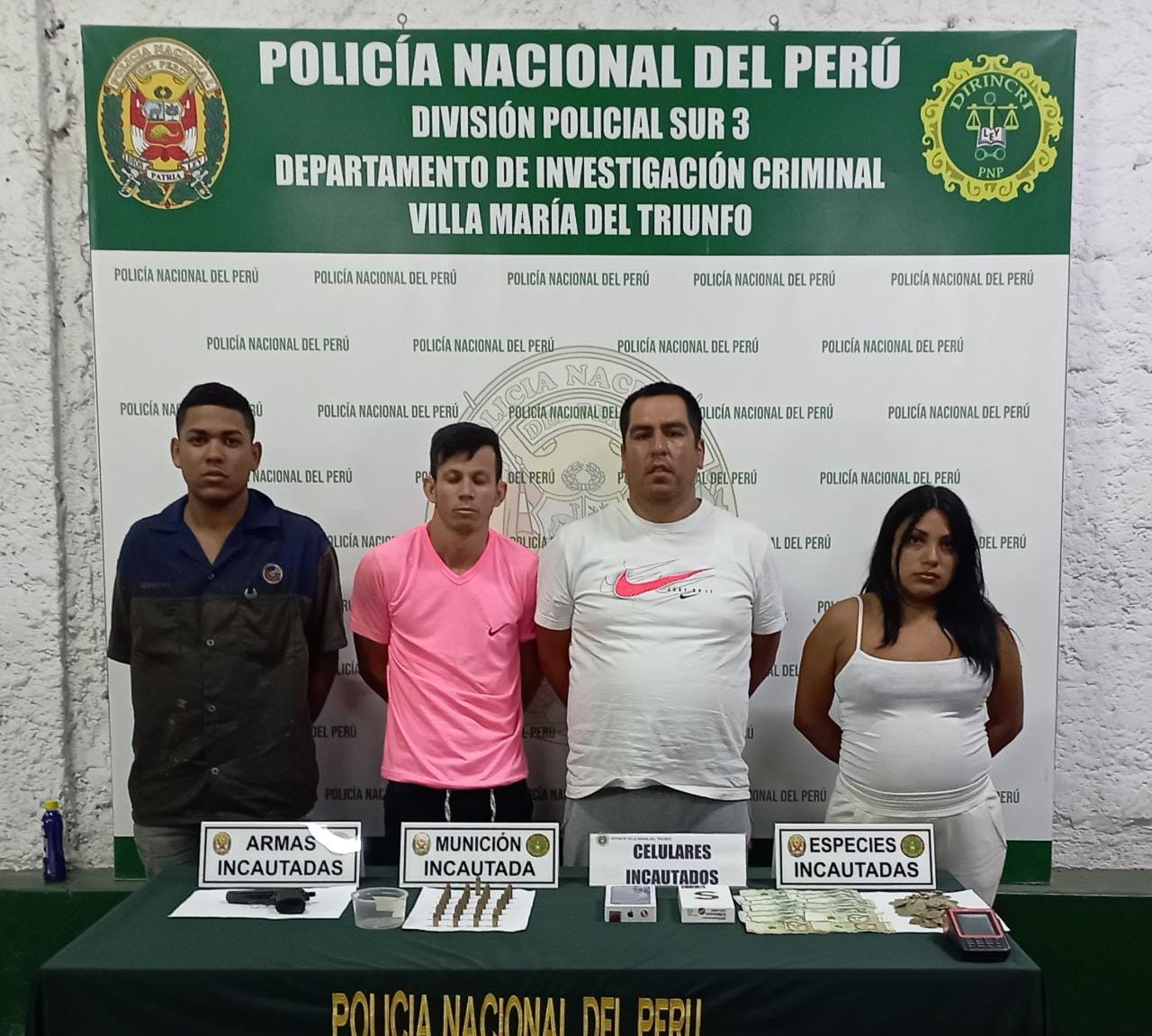 Horas después, Katherine Solís, su pareja Javier Junior Velásquez Príncipe (36), fueron intervenidos en San Juan de Miraflores y en su casa se encontró las especies robadas, una pistola y municiones. También se detuvo a los venezolanos Virgilio José Aponte Acosta (29), ‘huesito’, y Jhon Anderson Sifonte Gutiérrez (27).
