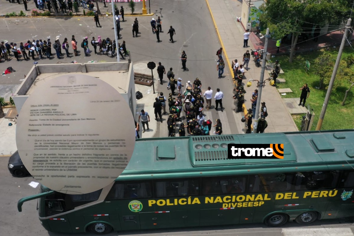 La misma noche del viernes, la UNMSM, a través de su apoderado judicial, el abogado Abelardo Rojas Palomino, envió una carta al jefe de la Región Policial de Lima, coronel PNP Víctor Zanabria Angulo, donde le narra los hechos y le solicita una pronta intervención. “Se solicita de carácter urgente que el personal de su cargo proceda a la liberación de las puertas tomadas ilegalmente conforme a lo expuesto en el párrafo precedente, con el objetivo de recuperar el recinto universitario de la UNMSM”, dice la misiva.