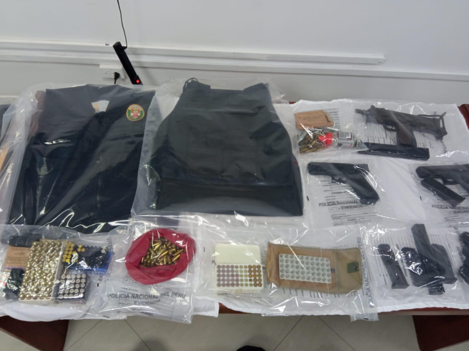 Durante la inspección en el domicilio del detenido ‘Coco’, ubicado en el complejo habitaciones Ciudad Nueva, en el Callao, los policías incautaron una pistola ametralladora tipo uzi, una pistola Glock, una pistola sin marca, tres placas de protección balística, un chaleco color negro con el bordado del escudo y las siglas de la PNP. Así también 49 cartuchos calibre 45, 49 balas calibre 9 mm, dos cascos de motociclista, una mochila de lona color rojo para delivery y varios envoltorios con droga.