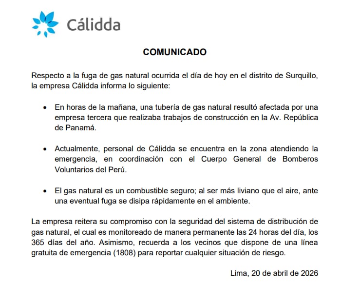Por su parte, la empresa Cálidda informó que una compañía tercera, que realizaba trabajos de construcción en la vía pública, habría dañado una tubería de gas natural. Tras el incidente, cuadrillas técnicas se desplazaron al lugar para ejecutar las maniobras de reparación y proceder con el cierre de válvulas.