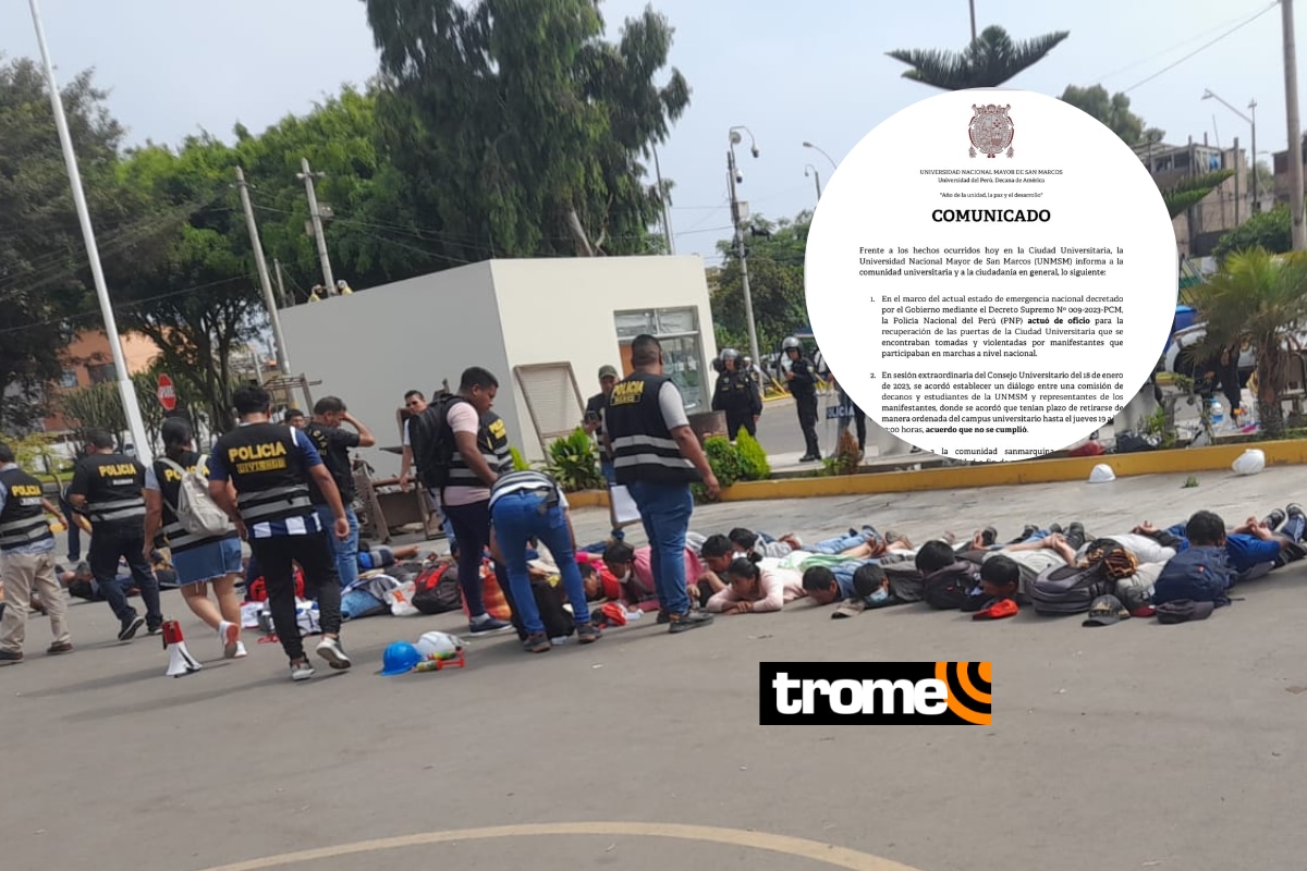 “En el marco del actual estado de emergencia nacional... la Policía Nacional actuó de oficio para la recuperación de las puertas de la Ciudad Universitaria que se encontraban tomadas y violentadas por manifestantes que participaban en marchas a nivel nacional”, señala el comunicado de la UNMSM.
