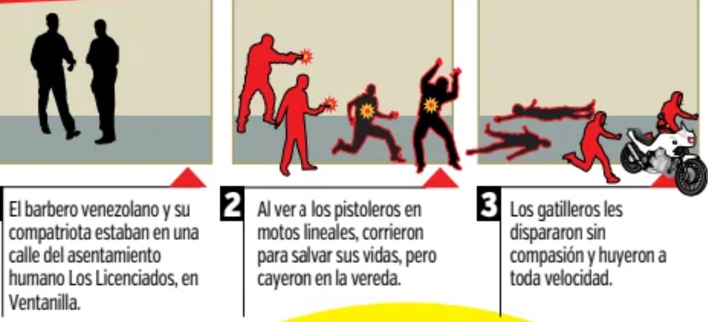 Era un disparo tras otro. Quince segundos que parecían una eternidad y en los que no se podía escuchar otro ruido. Un video muestra la crueldad del ataque. Más de 40 balazos ejecutaron, a quemarropa, despiadados sicarios, uno de ellos al parecer con mini Uzi, contra dos venezolanos, en el distrito chalaco de Ventanilla. El barbero John Davis García Malave (23) y Esteban Francisco Guerra Azocar (31) son las víctimas de este doble crimen ocurrido la noche del sábado.