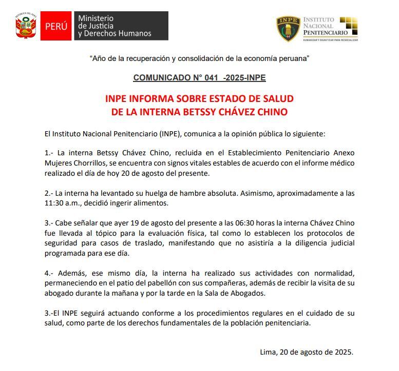 El comunicado de la institución recalcó que la salud de la interna era estable y que seguirán cumpliendo con los protocolos habituales de resguardo. “El INPE seguirá actuando conforme a los procedimientos regulares en el cuidado de su salud, como parte de los derechos fundamentales de la población penitenciaria”, señalaron.