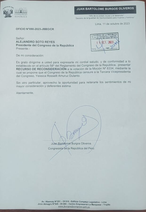 En horas de la noche, el parlamentario Juan Burgos (Unidad y Diálogo) presentó una reconsideración, dirigida al presidente del Congreso, Alejandro Soto (APP), para volver a votar la moción de censura.