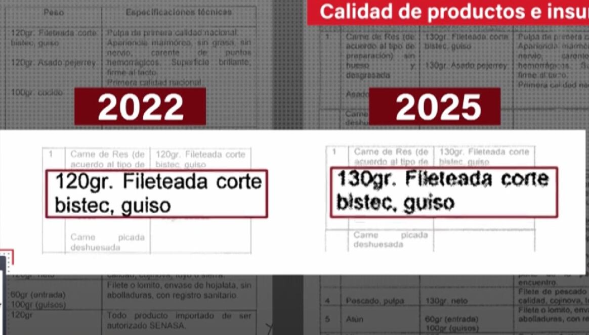 Los requerimientos son claros para la administración del Congreso. Los 120 gramos desde carne de res fileteada para bistec que se pedía en el 2022 no fueron suficientes, ahora solicitan 130 gramos. Tampoco fueron suficientes los 180 gramos de chuleta, la ración debe aumentar a 200 gramos. Los filetes de pollo y pescado eran de 120 gramos, ahora se requieren 130.