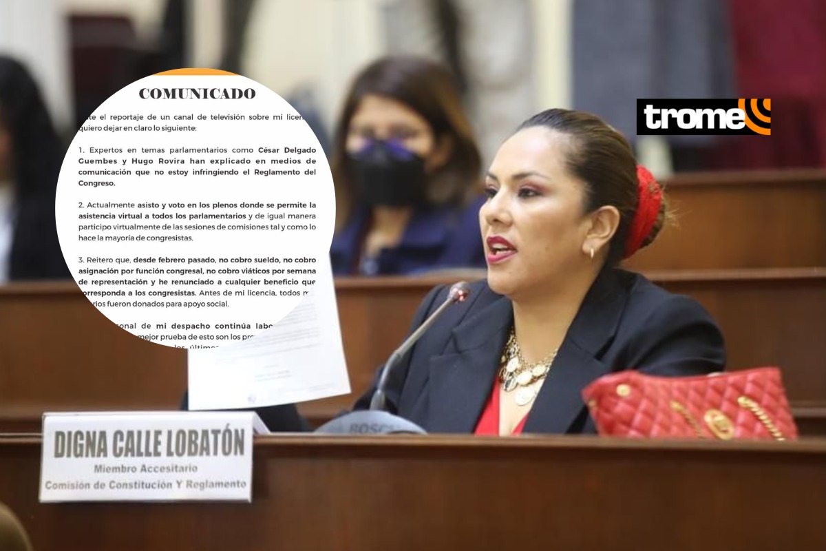 Telecongresista. La legisladora Digna Calle Lobatón, de la bancada Podemos Perú, aseguró que no ha cometido ninguna falta o infringido el Reglamento del Congreso al permanecer fuera del país por más de cuatro meses, desde enero de este año, y participar en las sesiones del pleno con votaciones a través de la plataforma virtual del Poder Legislativo.