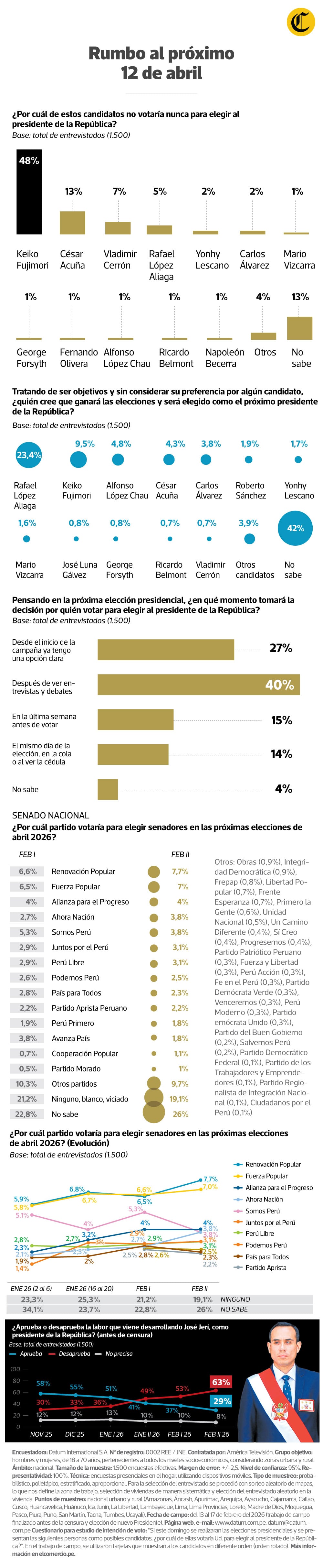 La medición, aplicada del 13 al 17 de febrero de 2026 a 1500 personas en el ámbito urbano y rural, se realizó con un nivel de confianza de 95%. El estudio no recoge aún los efectos de la reciente crisis política ni el cambio de gobierno entre José Jerí y José María Balcázar.