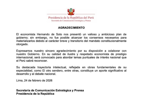 Mediante un comunicado oficial encabezado con la palabra “Agradecimiento”, la Presidencia de la República confirmó que Hernando de Soto no asumirá la Presidencia del Consejo de Ministros, poniendo fin a las versiones que circulaban en el ámbito político. El Ejecutivo precisó que no se lograron los consensos necesarios para formalizar su incorporación al gabinete.