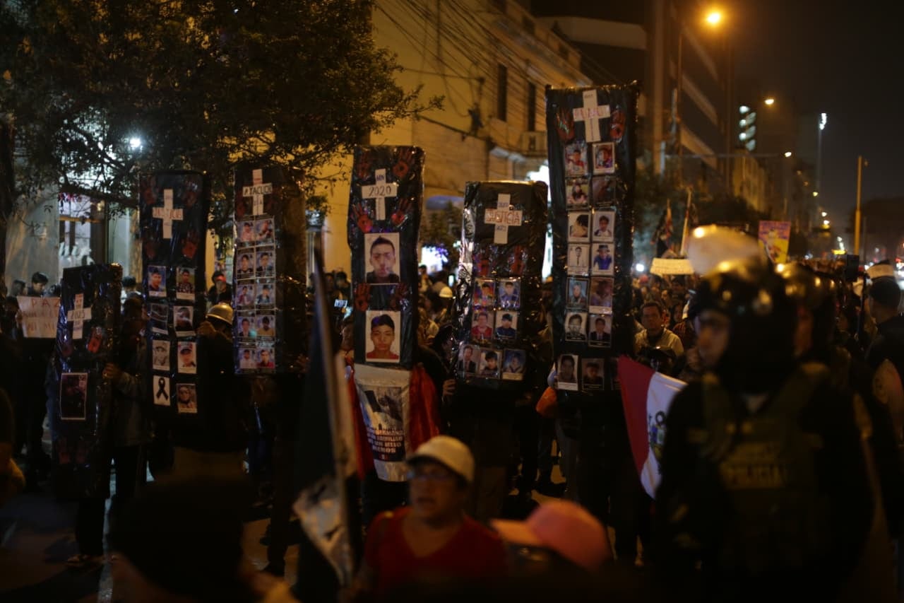 Los manifestantes, convocados a través de las redes sociales, exigieron justicia para Eduardo Ruiz, el rapero que falleció durante la marcha del 15 de octubre tras el disparo efectuado por el efectivo policial Luis Magallanes. Justamente, su familia pidió a los asistentes guardar un minuto de silencio en su memoria.