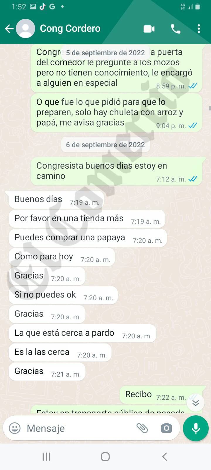 ‘El Comercio’ mostró las conversaciones por WhatsApp entre la legisladora y el exasesor parlamentario, que muestran que ella lo mandaba de compras y a realizar otros mandados.