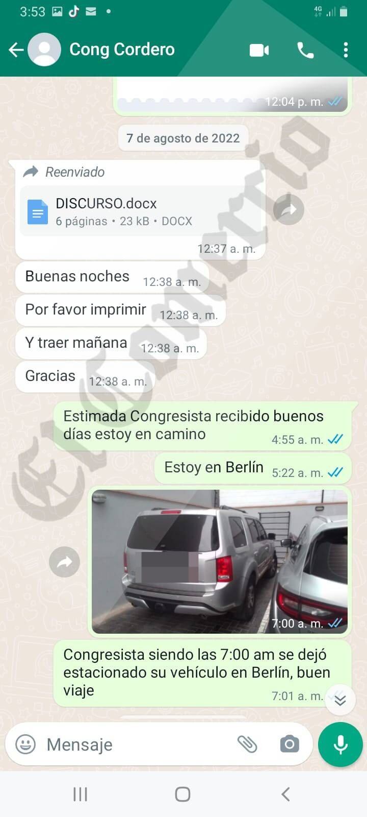 Otra de las conversaciones muestra que el exasesor parlamentario llegó a la casa de la legisladora, ubicada en la calle Berlín, en Miraflores, a las 7 a.m. Según su versión, a esa hora tenía que recogerla todos los días para llevarla al Congreso.