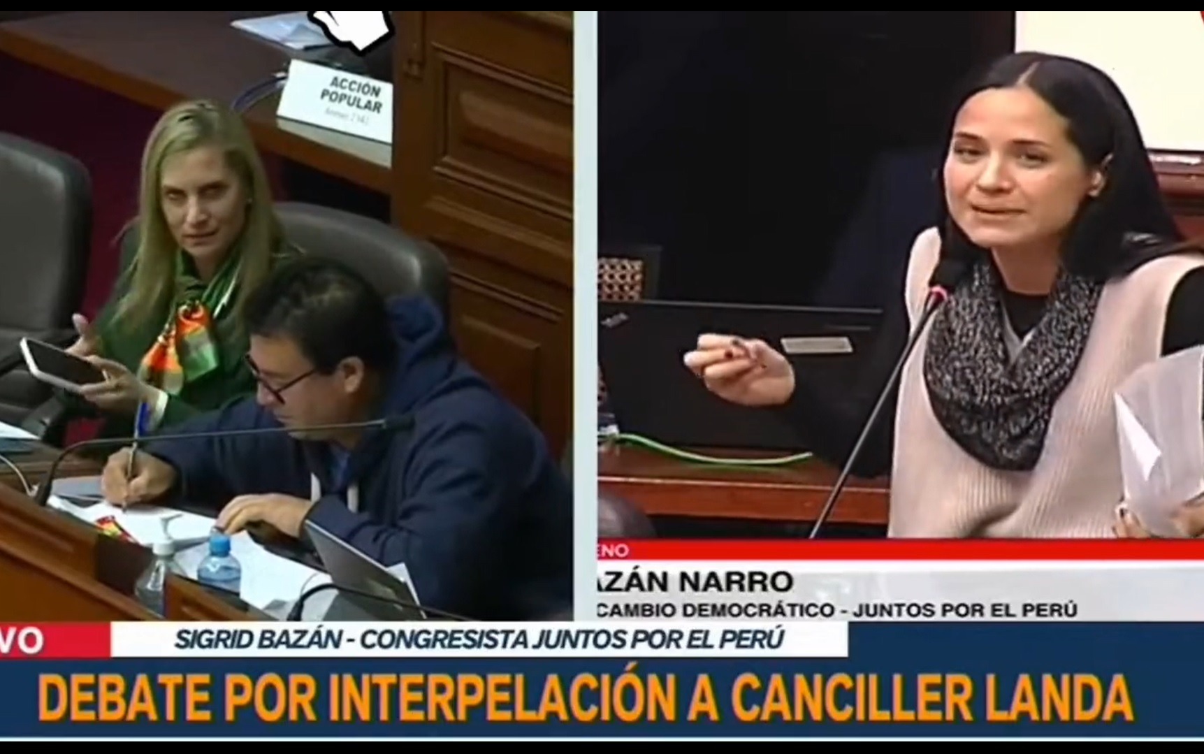 La expresidenta del Parlamento María del Carmen Alva (Acción Popular) se burló de su colega Sigrid Bazán (Juntos por el Perú), durante la interpelación del canciller César Landa en el Pleno del Parlamento.