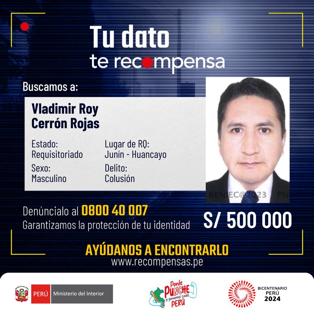 Días atrás, el Ministerio del Interior informó que Cerrón fue reincorporado al Programa de Recompensas, junto al exministro de Transportes Juan Silva. Actualmente, el Estado ofrece S/ 200 mil por información que permita su captura.