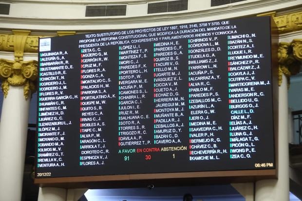 La “Ley de reforma constitucional que modifica la duración del mandato de la presidenta de la República, congresistas y parlamentarios andinos” se aprobó con 93 votos a favor, 30 en contra y 1 abstención.
