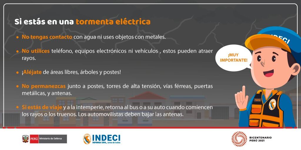 El Instituto Nacional de Defensa Civil (Indeci) dio una serie de recomendaciones a la población frente a descargas eléctricas como las que se produjeron en Lima y el Callao este lunes. En una publicación en sus redes sociales, la institución destacó que es importante mantener la calma.