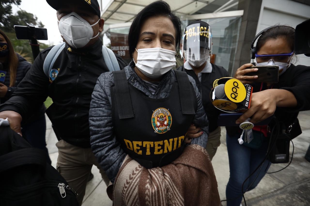 La exfuncionaria pública salió de su vivienda ubicada en el distrito de Surco, enmarrocada y portando un chaleco de ‘detenida’. Morales es trasladada a bordo de un vehículo de lunas polarizadas, a la sede de la Prefectura, en el Cercado de Lima.