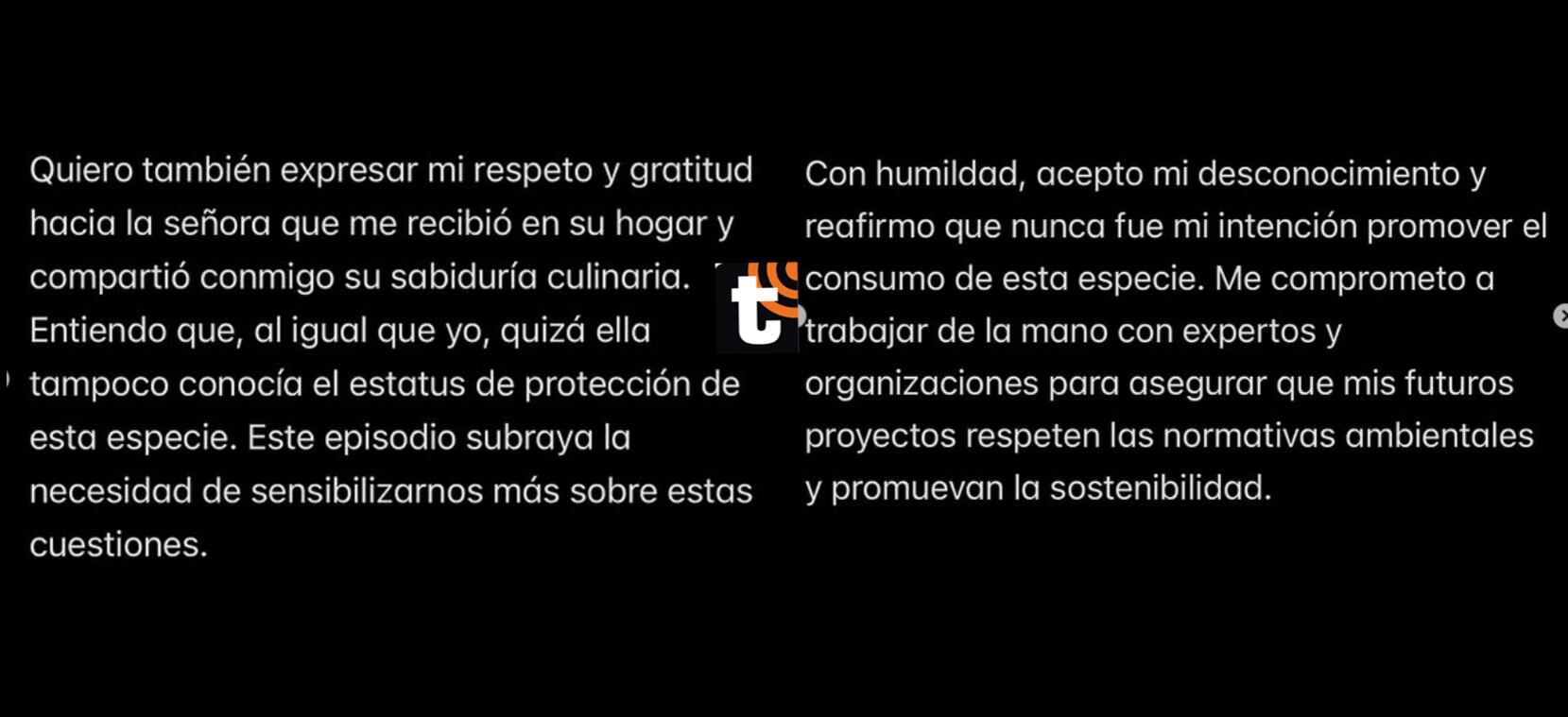 También agradeció a la mujer que lo acompañó en la preparación del plato y que lo recibió en su hogar, compartiendo su “sabiduría culinaria”: “Entiendo que, al igual que yo, quizá ella tampoco conocía el estatus de protección de esta especie. Este episodio subraya la necesidad de sensibilizarnos más sobre estas cuestiones”.