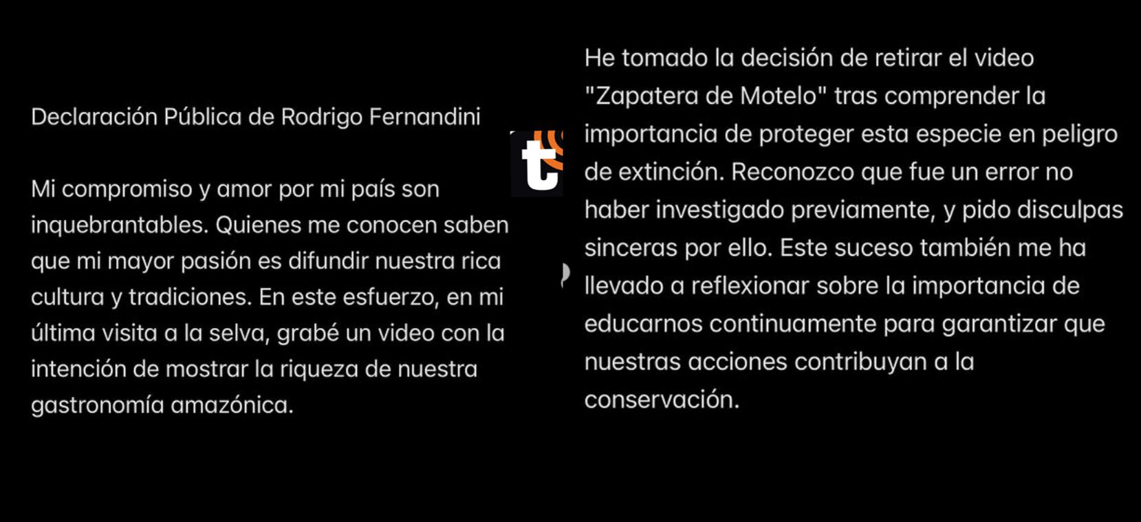 Fernandini añadió que decidió retirar el video de la Sarapatera de Motelo tras comprender la importancia de proteger esta especie en peligro de extinción: “Reconozco que fue un error no haber investigado previamente, y pido disculpas sinceras por ello”.