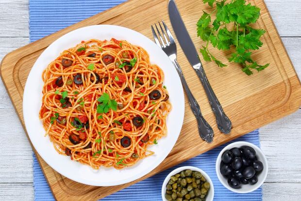 En otra hornilla, pondrás en una sartén 50 g de mantequilla con un chorro de aceite. Retirar del fuego y añadir 150 g de aceitunas licuadas y cuatro tomates pelados y picados gruesos. En la misma sartén sofreír tres dientes de ajo picados con un chorrito de aceite junto con el contenido de dos sobres de Doña Gusta Gallina y el resto de ingredientes. Llevar al fuego nuevamente y cocinar por un minuto para obtener la salsa. Mezclar con los espaguetis escurridos, para luego servir bien caliente, con queso parmesano rallado.