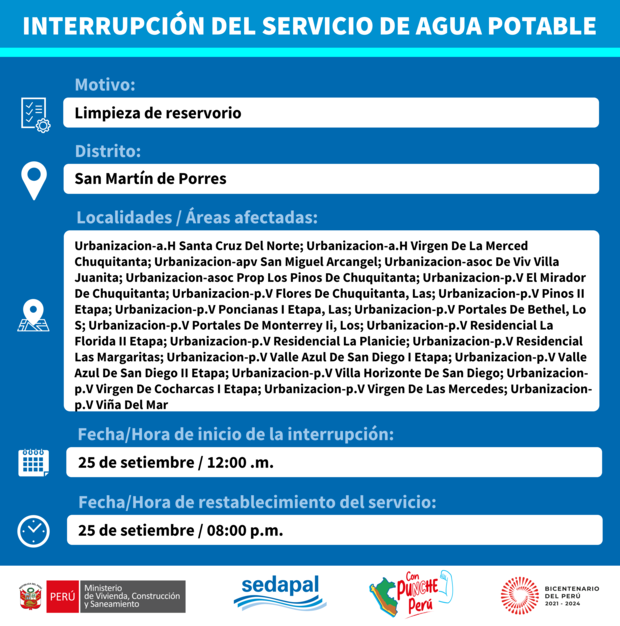 En tanto, a través de su Twitter, el Servicio de Agua Potable y Alcantarillado de Lima compartió información sobre cortes de agua potable desde este lunes 25 de setiembre en algunos distritos. Aquí te precisamos.