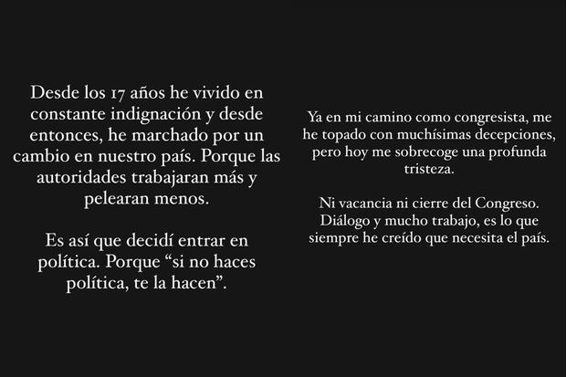 Minutos después se pronunció desde su cuenta de twitter . “Desde los 17 años he vivido en constante indignación y desde entonces, he marchado por un cambio en nuestro país, para que las autoridades trabajaran más y pelearan menos. Es así que decidí entrar en política, porque si o la haces, te la hacen”, expresó la representante de Juntos por el Perú.