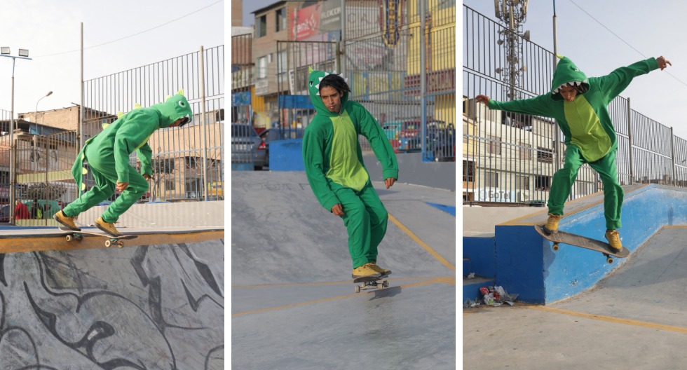 Peruano que se respeta. Sin ser aquel temible Tiranosaurio rex, un gracioso y divertido dinosaurio se desliza en un skateboard por las calles empinadas de Villa El Salvador. En este particular traje, el skater Jairo Choque Sulca (23) sorprende con sus maniobras y trucos a los niños e impulsa de un modo divertido la práctica de este deporte. Es conocido en su barrio como ‘Dino Skate’ porque suele realizar giros y saltar por los aires vestido con su disfraz verde. Los niños al verlo tratan de imitarlo y ese es su modo, cuenta él, que los menores se diviertan, se alejen de las drogas y la delincuencia y practiquen el deporte del skateboarding.