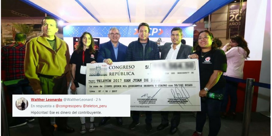 Pero la cifra no ha convencido a los usuarios de las redes sociales. En Twitter, la imagen de Presidente del Congreso Luis Galarreta acompañado del oficial mayor José Cevasco y el congresista Edmundo del Águila, tiene cientos de críticas a pesar de ser mayor a la donación del año pasado en más de 90 mil soles.