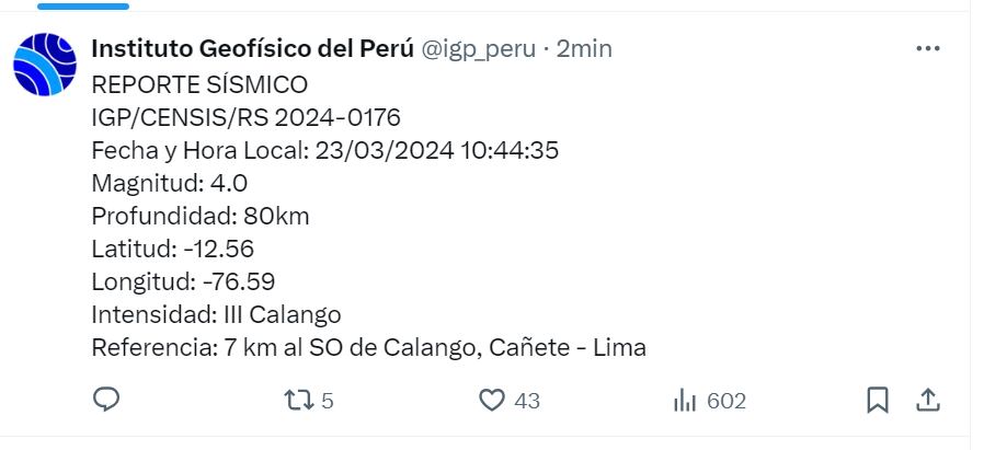 El Instituto Geofísico del Perú (IGP) anunció que este sábado 23 de marzo se produjo un sismo de magnitud 4.0 a 7 kilómetros al suroeste del distrito de Calango, en Cañete. De momento, no se ha informado de daños materiales a raíz de este movimiento sísmico.
