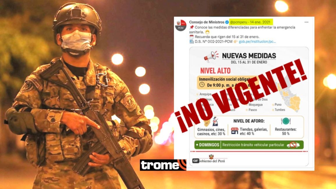 La imagen compartida, denominada también fake, informa que las supuestas nuevas medidas regirán del 15 al 30 de enero del presente año. Además, señala que el nuevo toque de queda de 9:00 p.m. hasta las 4:00 a.m. para las provincias que se encuentran en el nivel sanitario alto donde figura Lima Metropolitana junto a otras 12 zonas del país.