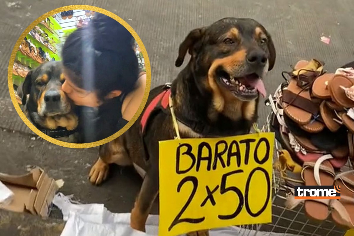 El perrito, armado con un cartel que ofrecía 2 sandalias por 30 soles, permaneció todo el día junto a su dueña ayudándola a vender.
