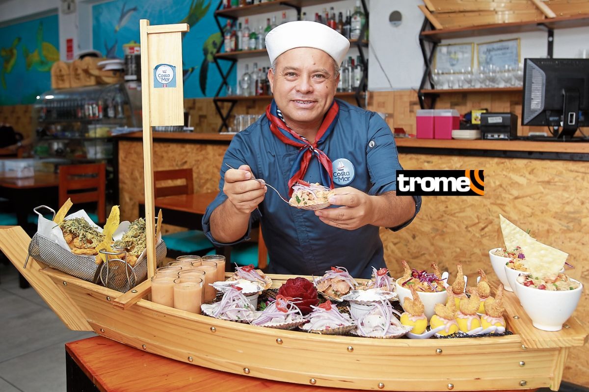 Un enorme barquito de madera que pesa casi 20 kilos y mide 1.20 metros es conocido como el ‘Titanic Cebichero’ porque lleva en su interior chaufa y arroz con mariscos, causa con langostinos crocantes al panco, cebiche clásico y mixto, leche de tigre y chicharrón de pota. Este contundente plato marino es la sensación en el restaurante ‘Costa del Mar’ en Villa El Salvador, donde todos los fines de semana decenas de familias forman largas colas para vivir la experiencia de saborear esta voluminosa oferta.