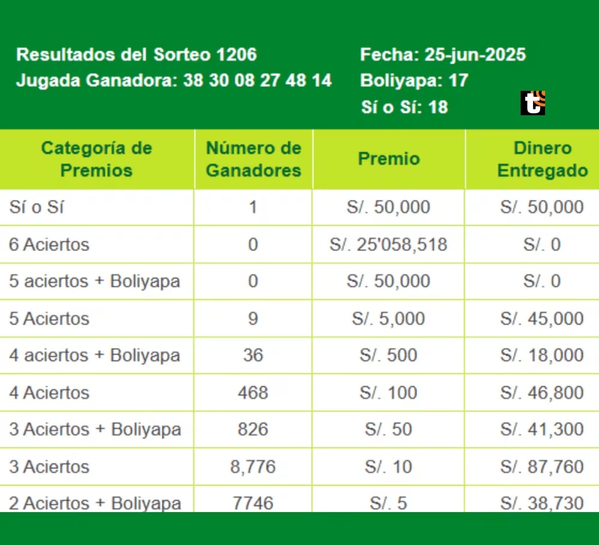 Mientras que con el “Sí o Sí” La bolilla ganadora fue: 18 - HUBO UN GANADOR DE S/ 50 000.