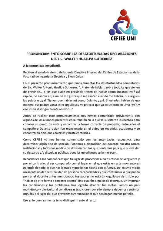 “El docente Walter Huallpa es un reconocido racista y clasista en la FIEE de la UNI. No es la primera vez que se tiene un incidente como este, pero parece que este sujeto es intocable, por favor investigar y si es posible retirarlo”, señaló.
