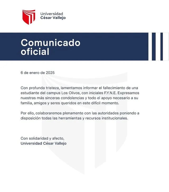 “Lamentamos informar el fallecimiento de una estudiante del campus de Los Olivos, con iniciales F.Y.N.E. Expresamos nuestras más sinceras condolencias y todo el apoyo necesario a su familia, amigos y seres queridos en este difícil momento”, indica el comunicado de la UCV.