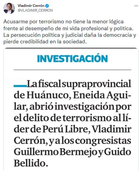 El secretario general de Perú Libre, Vladimir Cerrón, consideró que “no tiene lógica” que se le acuse de terrorismo. Su respuesta se dio luego de que se le iniciara una investigación fiscal en Huánuco por la supuesta comisión de este delito. En sus redes sociales, denunció ser víctima de persecución política.