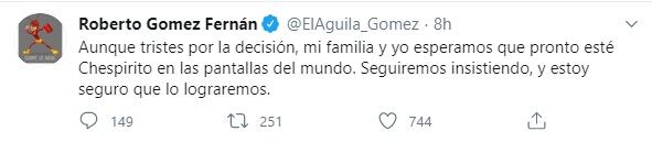“Aunque tristes por la decisión, mi familia y yo esperamos que pronto esté Chespirito en las pantallas del mundo. Seguiremos insistiendo, y estoy seguro que lo lograremos”.