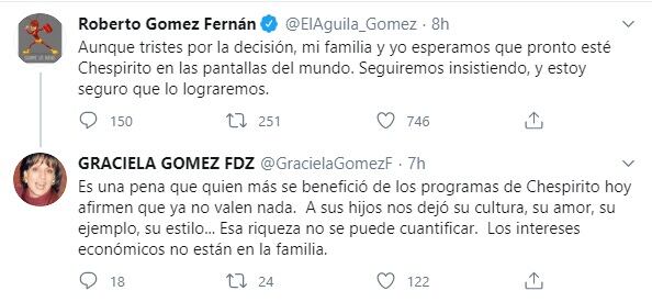 “Es una pena que quien más se benefició de los programas de Chespirito hoy afirme que ya no valen nada. A sus hijos nos dejó su cultura, su amor, su ejemplo, su estilo. Esa riqueza no se puede cuantificar. Los intereses económicos no están en la familia”, escribió la joven también en Twitter.