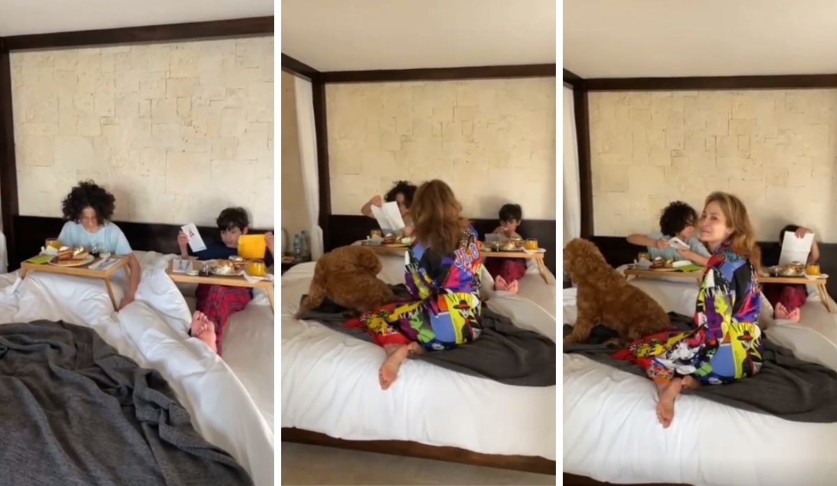 Mediante sus redes sociales, la cantante estadounidense compartió un video donde se le ve llegando a la cama de los menores con sus respectivos desayunos y unas cartas. Ella les canta una canción mientras los pequeños se emocionan al leer las cartas.