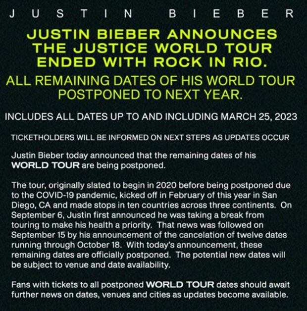 Un nuevo aplazamiento en una gira que debería haber comenzado en 2020 y que primero se pospuso por la pandemia, para comenzar en febrero de este año en San Diego (EE.UU.). Tras pasar por diez países, Bieber anunció que se tomaba un descanso para dar prioridad a su salud.