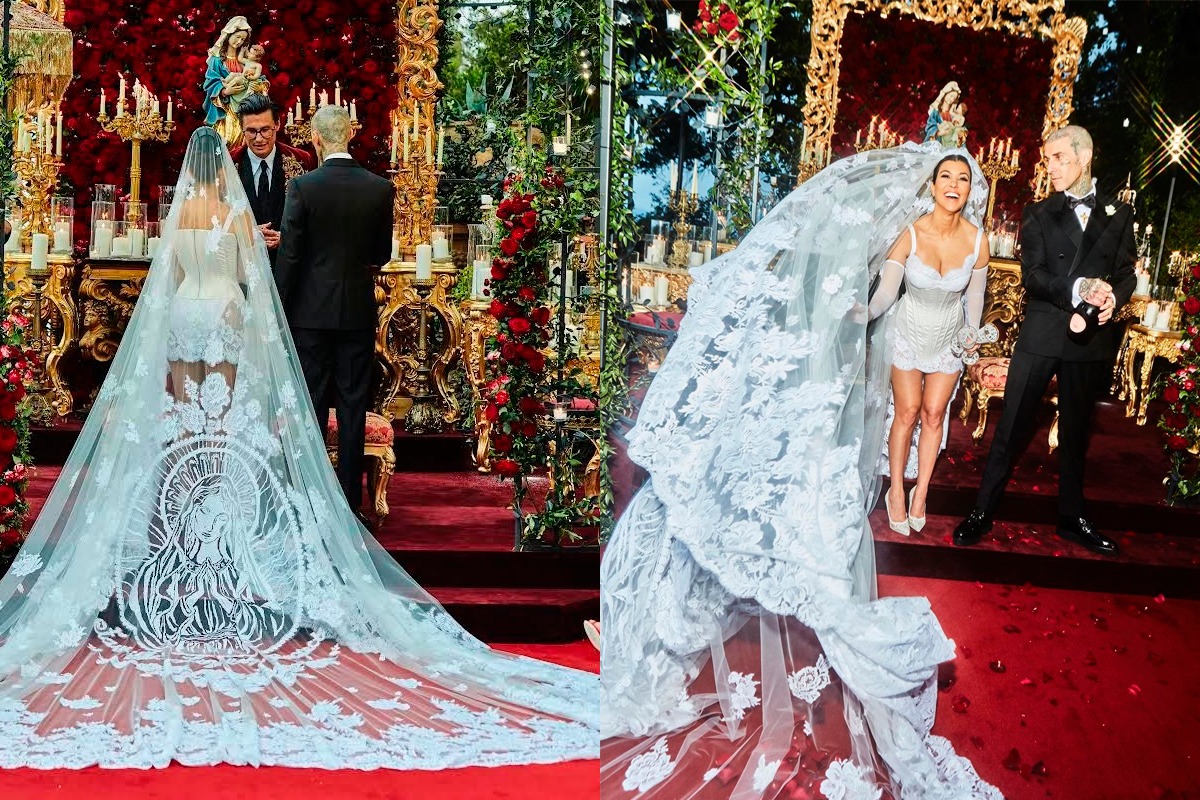 Kourtney Kardashian y Travis Barker se casaron por tercera vez el 22 de mayo de 2022 en Portofino, Italia. Para la ocasión, la mayor del clan Kardashian eligió un minivestido con corsé de satén y encaje de alta moda firmado por Dolce & Gabanna. Lo más llamativo del ‘look’ fue el velo catedral blanco, en el cual había flores bordadas a mano inspiradas en los muchos jardines mediterráneos de la ciudad costera, así como una representación de la Virgen María, inspirada en un detalle del cuerpo de su esposo.