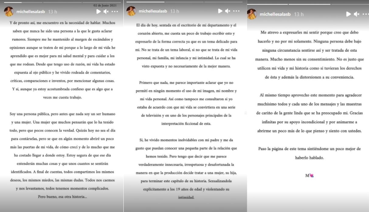 “Me cuesta trabajo escribir esto y expresarlo de la forma correcta ya que es un tema delicado para mí. No se trata de un tema laboral, sino que se trata de mi vida personal. Primero que nada, me parece importante aclarar que yo no permití en ningún momento el uso de mi imagen, mi nombre y mi vida personal. Así como tampoco me consultaron si yo estaba de acuerdo con que mi vida se convirtiera en una serie de televisión y en uno de los personajes principales de la interpretación ficcional de esta”, continúo.