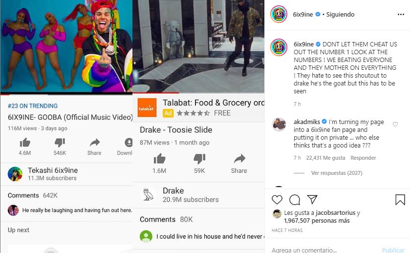 Según se pudo observar en su más reciente publicación, el estadounidense comparó el número de reproducciones que tiene su single “GOOBA” con “Toosie Slide” de Drake. “Yo soy el número uno, miren los números. ¡Estamos golpeados a todos en la madre!”, escribió.