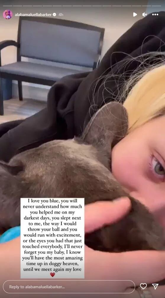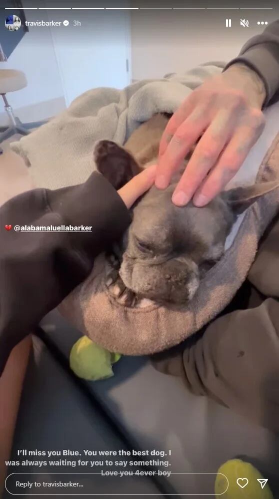 “Te extrañaré Blue. Fuiste el mejor perro. Siempre estaba esperando que dijeras algo. Te amo 4ever chico”. Travis etiquetó a su hija mayor en su historia y luego compartió una desgarradora imagen de él sentado en su sofá cargando al cachorro, como si se estuviera despidiendo de él.