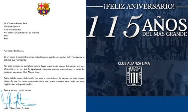 “Me complace hacerle llegar nuestra más sincera felicitación por esta efeméride a la vez que agradeceré transmita nuestra enhorabuena a todos las personas vinculadas al club Alianza Lima”, se refiere la misiva del Barcelona.