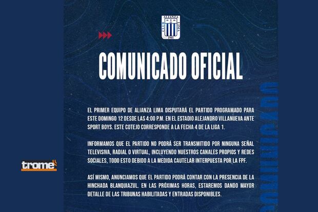 “El primer equipo de Alianza Lima disputará el partido programado para este domingo 12 desde las 4.00 p.m., en el estadio Alejandro Villanueva ante Sport Boys. Este cotejo correspondiente a la fecha 4 de la Liga1″, se puede leer en el primer párrafo de este comunicado.