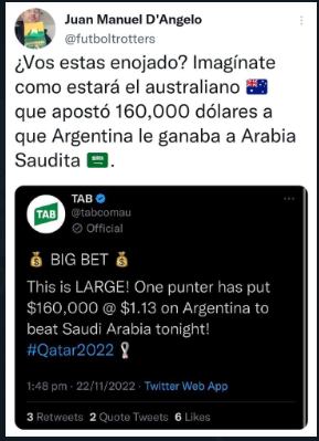 En redes sociales, son diferentes los usuarios que expresaron su pesar por este resultado. Sin embargo, uno de los que llamó la atención fue el caso de un australiano que había apostado 160,000 dólares al triunfo de Argentina.