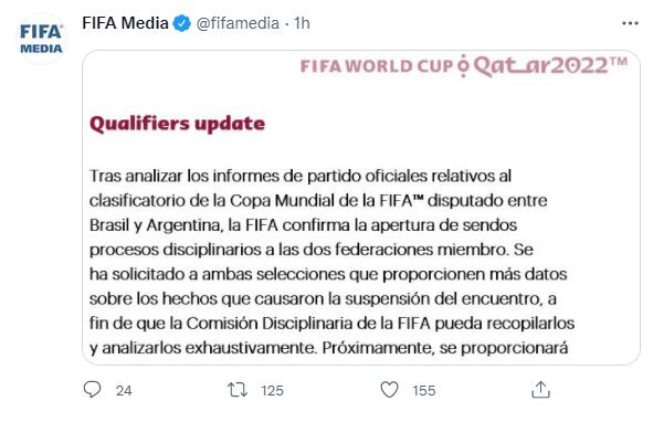 Tras la polémica suspensión de partido entre las selecciones de Brasil y Argentina por las Eliminatorias a Qatar, la Federación Internacional de Fútbol Asociado (FIFA) anunció este martes que abrió dos procedimientos disciplinarios contra las federaciones de Brasil y Argentina para investigar los hechos que causaron la interrupción del Súperclasico de América.