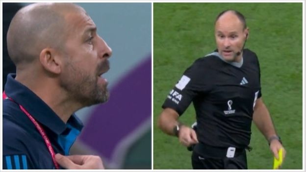 El juez español, al minuto 31, se acercó a la zona técnica de la ‘Albiceleste’ y amonestó a Walter Samuel, asistente de Lionel Scaloni. El motivo del castigo fue por reclamos, luego de que al exzaguero se muestre en desacuerdo con algunas determinaciones del réferi.